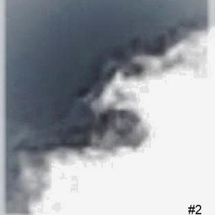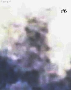 Below, in the 1st pic (#2) looks to be an elongated ship. To me, it looks like some sort of unit connected to the top. On the underside, you can see 5 sprays shooting out "clouds" for camouflage. #3 shows a round disc with a black apparatus on the top of it. It's projecting a wide stream of either a light or "clouds". There is light on the top side lower edge (8:00 position), reflecting whatever it is spraying and the wide spray changes the color of the clouds (brighter than the rest). The last photo looks to be similar to a whoopee cushion. The spout is spraying out "clouds" for camouflage as well. The underside of the round ship is darker than the top and the seam has several small lights around it. The round UFO also has a triangle attached to the top of it. Also, you can see a rectangle window that sits above the exhaust which looks to be spewing out an off-color "cloud" for cover. However, there have been witnesses who claim that there is a "being" hanging onto the side of the UFO. If you look closely, you can see sharp angles representing the elbows and knees.